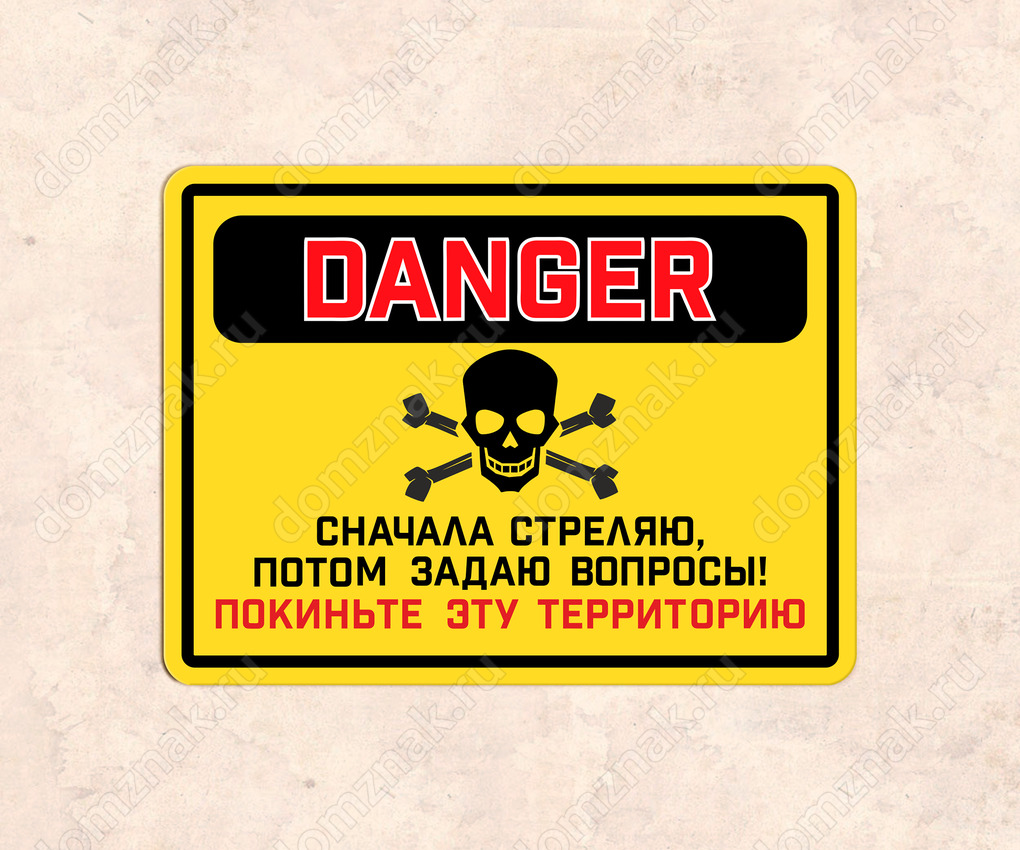 Табличка «Сначала стреляю, потом задаю вопросы! Покиньте эту территорию» изготовлена из пластика ПВХ, толщиной 4 мм. Изображение наносится по технологии УФ-печати. Табличка предназначена для использования как в помещении, так и на улице.