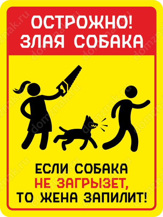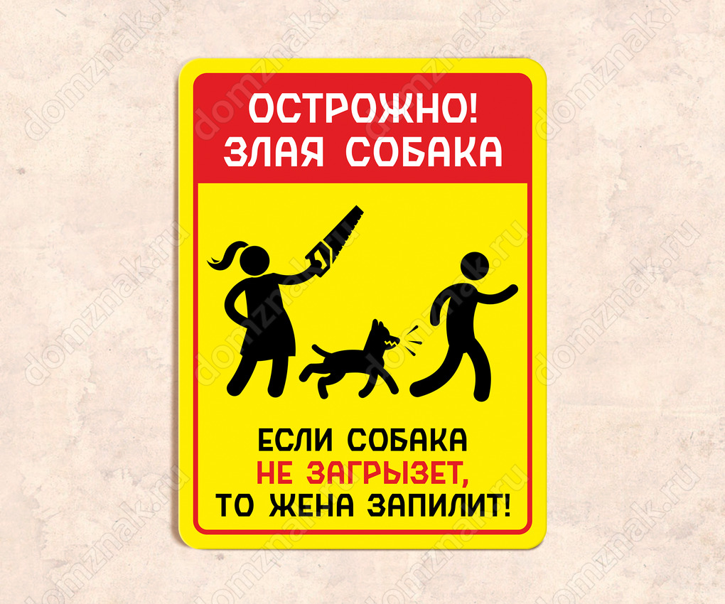 Табличка «Осторожно злая собака! Если жена не загрызет, то жена запилит»